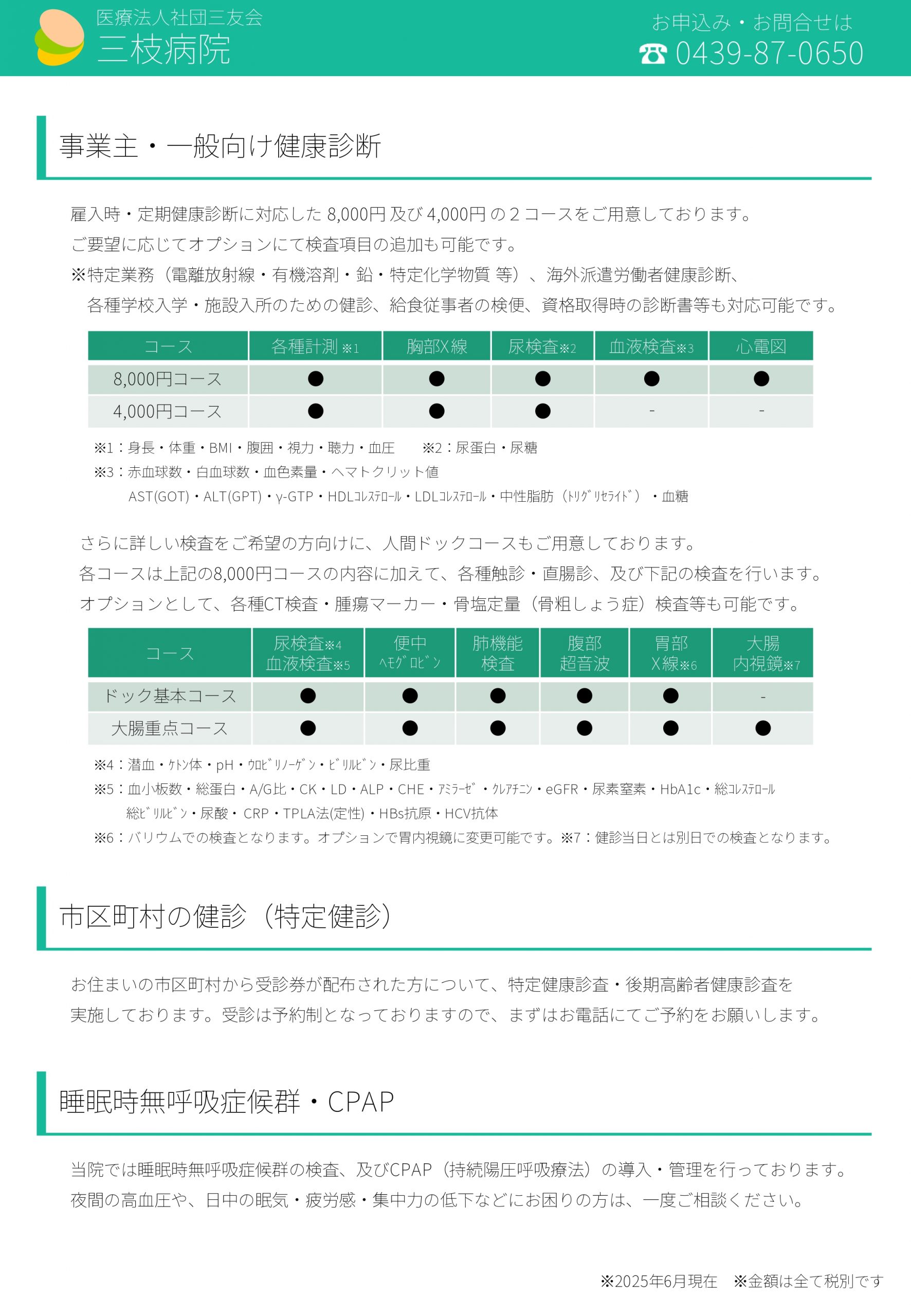 予約制になりますので、事前にお電話ください(0439-87-0650:健診担当まで)